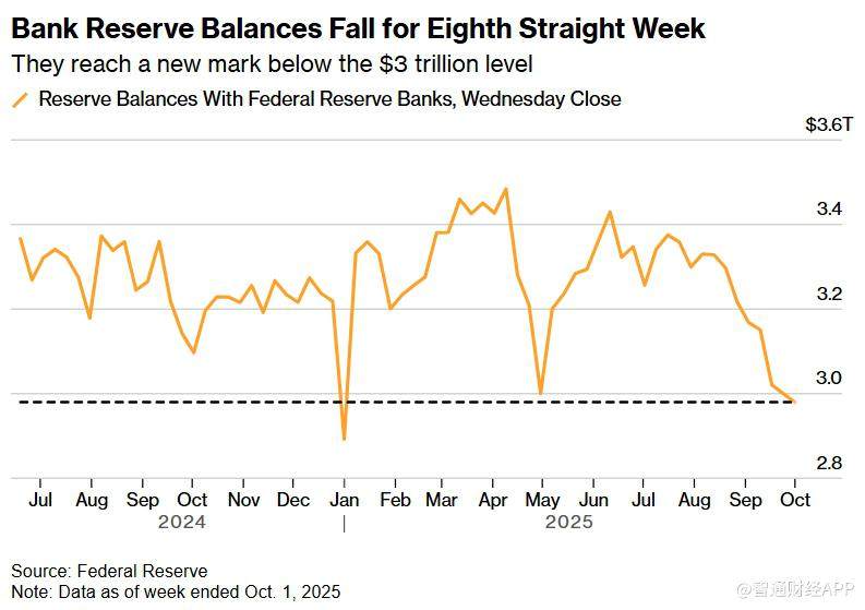 美国银行体系的准备金已连续八周下降,并首次跌破3万亿美元大关,令市场对美联储是否会提前结束缩表产生关注。根据美联储周四公布的数据,截至10月1日的一周,银行准备金减少201亿美元至2.98万亿美元,创下今年1月以来最低水平。